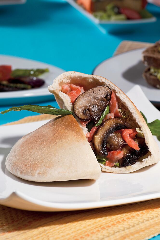 3. Caliente los panes pita, ojalá en horno convencional y no en el de microondas. Pártalos a la mitad y ábralos, rellénelos con alfalfa, lechuga y trozos de salmón marinado en salsa oriental. Por último, incorpore los hongos en forma decorativa.