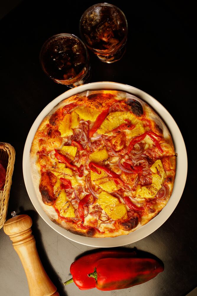 La Platina CR: Chorizo italiano aderezado, cebolla morada caramelizada, trocitos de piña a la parrilla y adornada con chile morrón. Todo sobre una masa 80% harina fuerte y 20% soya, para facilitar la digestión.