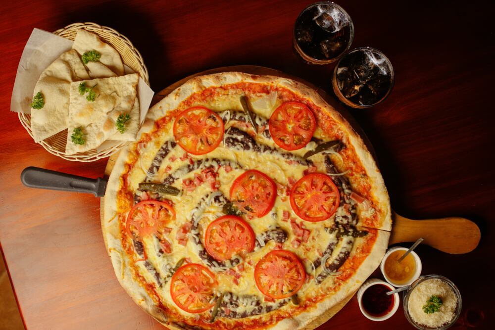 Mío Sole: Pasta de pizza con una cama de frijoles, chile picante y queso mozzarella . Además, lleva salsa de pizza, tomate, carne molida, cebolla y tocineta.