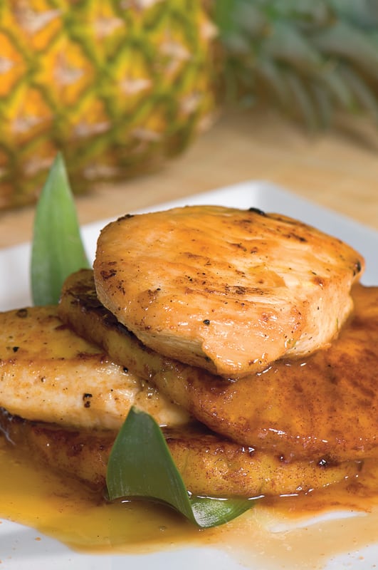 Coloque las rodajas de piña en el centro del plato y las medias pechugas sobre las rodajas. Báñelas con la salsa y decore con hojas de hierbabuena