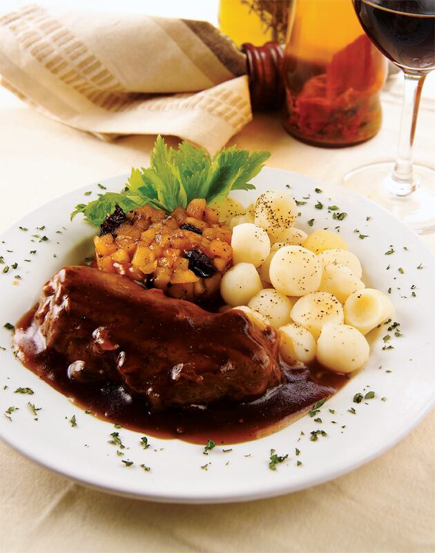 Sirva acompañada de papas noisette (en bolita) al vapor y * manzanas con ciruelas servidas en cubitos.