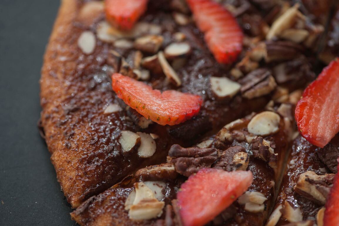 Por si fuera poco, los amantes del dulce podrían vivir también un verdadero éxtasis. El postre estrella se compone de masa de pizza horneada con Nutella, almendras, nueces, trozos de chocolate, fresas, leche condensada y caramelo.