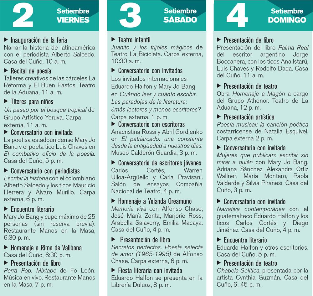 Otra de las actividades llamativas para el primer día de la Feria se realizará a las 5 p. m. en la planta alta de Casa del Cuño. El conversatorio El combativo oficio de la poesía contará con la presencia de otra de las voces internacionales, la poetisa estadounidense Mary Jo Bang, quien estará acompañada por el escritor tico Luis Chaves.