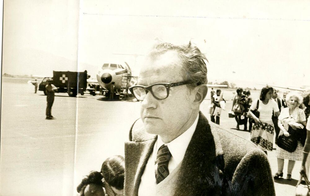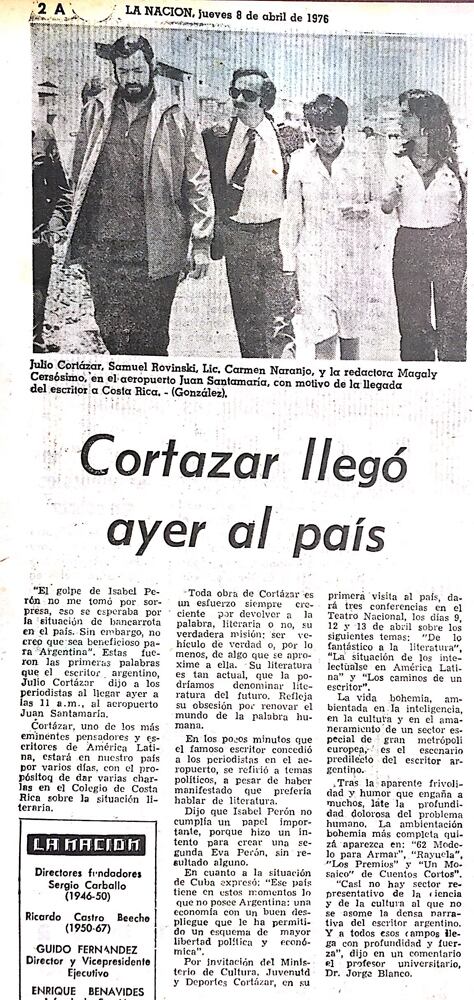 El argentino llegó al país el 8 de abril de 1976. La imagen que incluyó La Nación al día siguiente lo muestra en el aeropuerto, con su andar de dos metros, al lado de Carmen Naranjo, la redactora Magaly Cersósimo y el escritor Samuel Rovinski, quien lo había conocido en París y medió para lograr la visita.