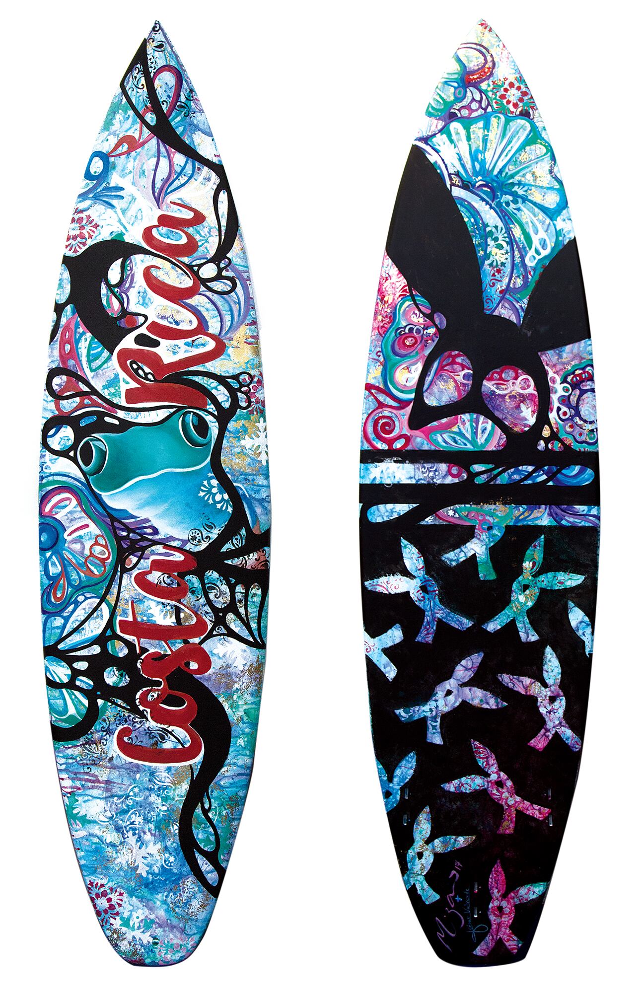Precisamente, fue ese concierto el que motivó a los artistas visuales Mónica Lizano y Julio César Valverde a dibujar y pintar algunos detalles de la biodiversidad de Costa Rica en una tabla de surf.