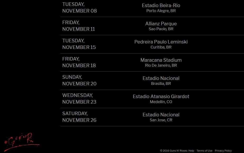 El grupo, que alcanzó su punto máximo con el álbum Appetite for Destruction de 1987 (fue el disco debut más vendido de la historia de Estados Unidos), actualizó en su sitio web oficial la lista de países a los que irán con su gira Not in This Lifetime, en donde se anuncia su visita a a Costa Rica para el 26 de noviembre del 2016, en el Estadio Nacional, en La Sabana.