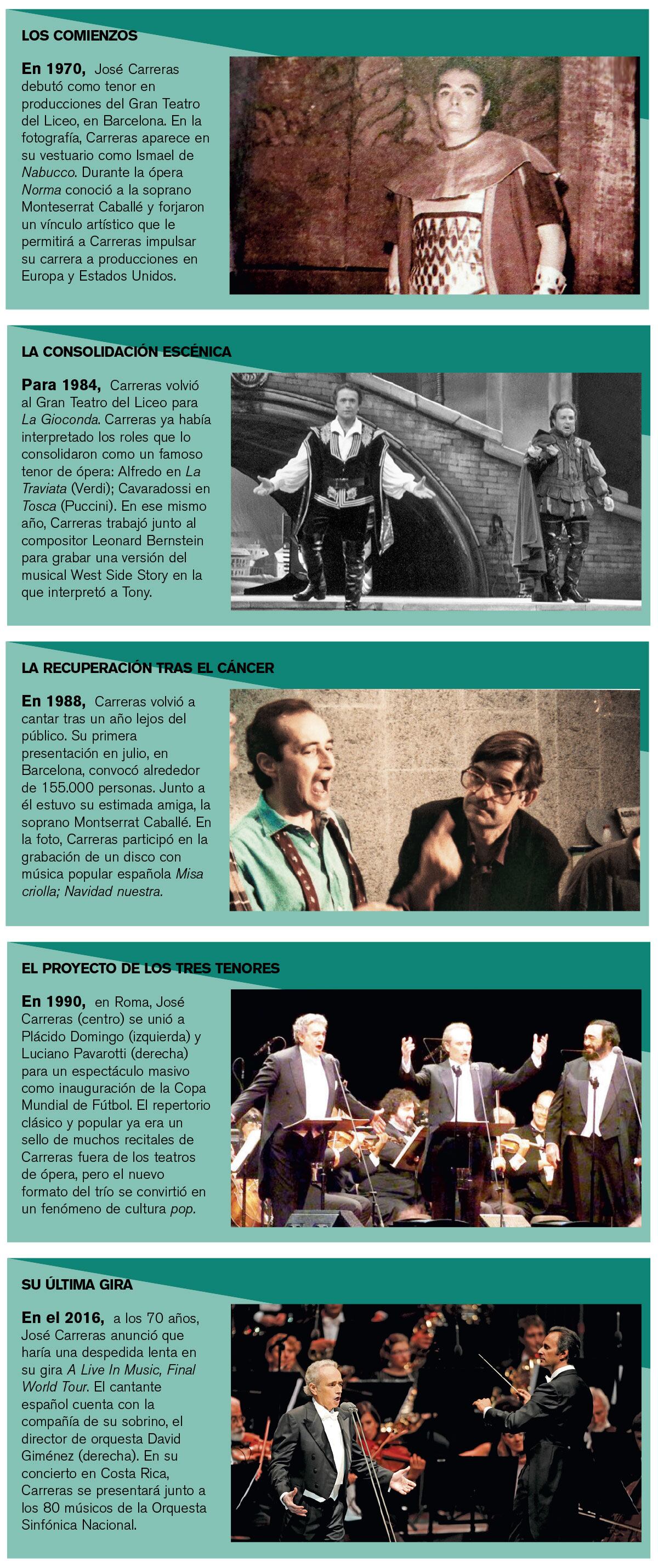 De un lado quedó su vida como tenor en la ópera europea. Del otro, luego de su regresar a los escenarios, está la fama del espectáculo Los Tres Tenores , junto a los también prominentes cantantes de ópera Luciano Pavarotti y Plácido Domingo.