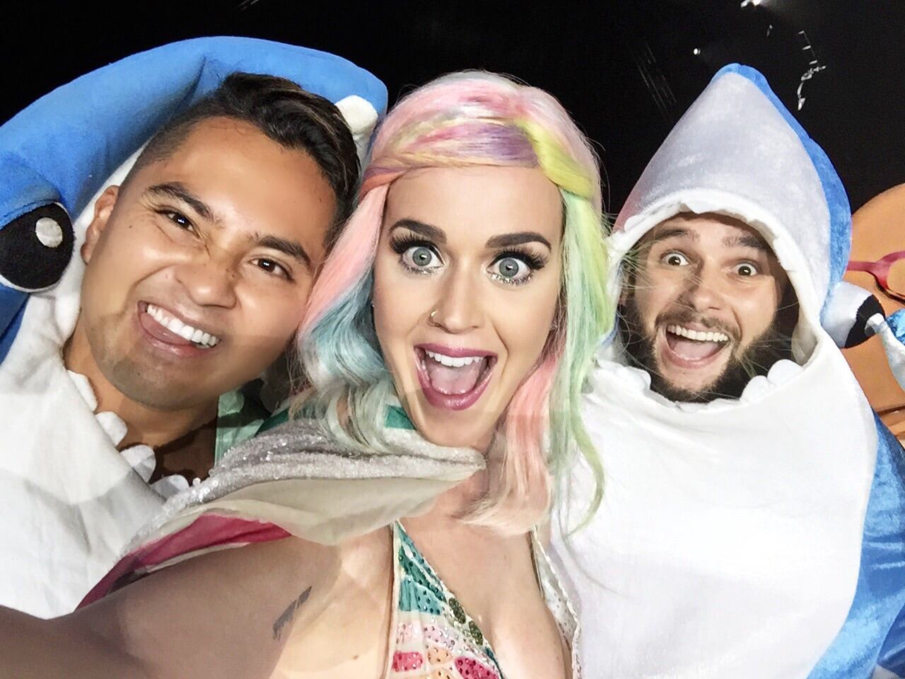 Cerca de las 10 p. m., Katy Perry hizo una pausa en su concierto para llamar a media docena de fanáticos para subirlos al escenario con ella. Los primeros a quienes vio, por supuesto, fue a los dos tiburones.