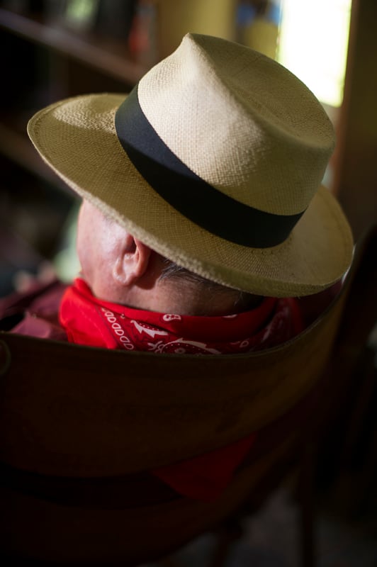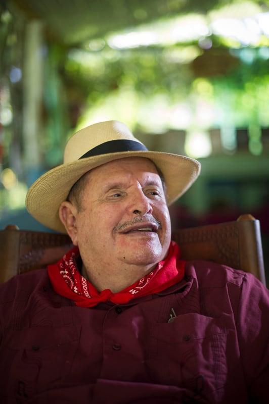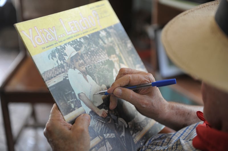 Se calza el sombrero de pita y se cuelga en la nuca, lazador, un pañuelo rojo de puntos blancos que anuda bajo la papada. “Este es Lencho”, dice, como si fuera a interpretar un número en el “planché” cerrado, adornado con recortes de periódicos, estatuillas, premios, fotografías, souvenirs , una mecedora, un tornamesa. Luego, le pide ayuda a Anita, su cuidadora, para guindarse el audífono que aminora su sordera, y se relame el bigote cortado a ras sobre su labio superior, como dibujado por la memoria.