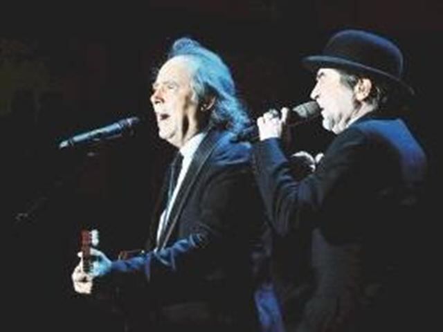 Los españoles desembarcaron en el escenario tico, puntuales, a las 8:30 p. m. Las luces se apagaron y en las pantallas apareció la animación de dos pájaros gigantes: uno con cresta blanca (Serrat) y otro con sombrero (Sabina).