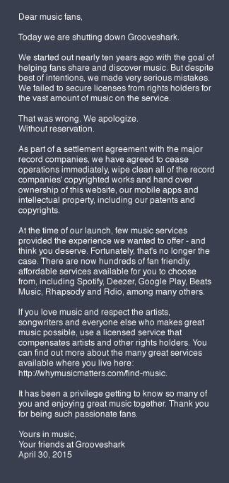 La plataforma de reproducción de música Grooveshark se vio forzada a cerrar su sitio en Internet, tras una larga batalla legal con la industria discográfica en Estados Unidos que la demandó por carecer de las licencias de derechos de autor.