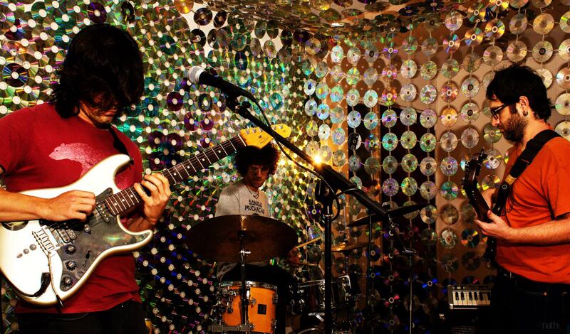 11:11 tocará en octubre junto a varios invitados, como el baterista Franco Valenciano (centro), quien grabó el disco pero no es parte de la banda. El grupo lo conforman Andrés Calvo (izq.), Genfin Jiménez y Fico Dörries (no en la foto). / Fotografía: Cortesía de Nath Méndez.