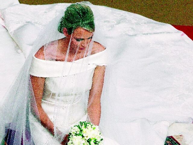 Miles de cristales Swarovski, madreperlas y un velo de 20 metros de largo: Charlene de Mónaco deslumbró con un vestido de novia color marfil, creado por el italiano Giorgio Armani, para su boda religiosa con el príncipe Alberto II, celebrada ayer en el patio del Palacio Gribaldi.