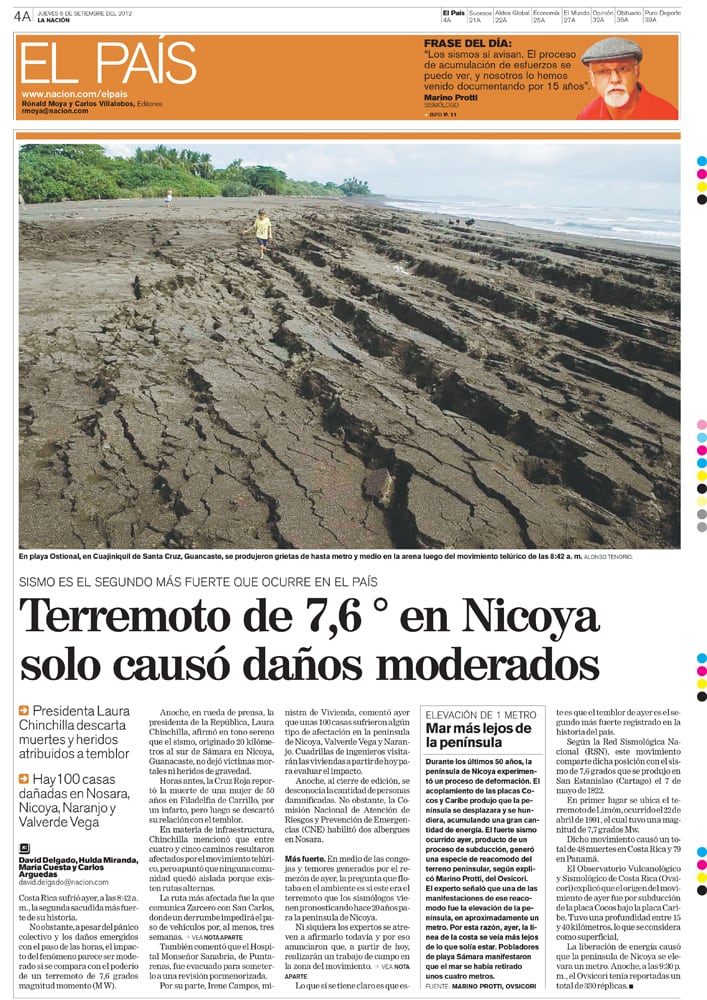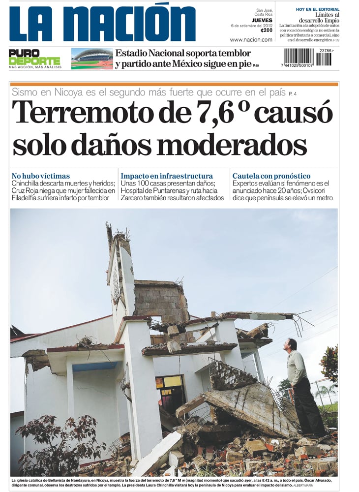 “Terremoto de 7,6 ° en Nicoya solo causó daños moderados” fue el título de La Nación el jueves 6 de setiembre de 2012, un día después del sismo. Si bien era temprano para enumerar todos los daños causados por el terremoto, desde entonces estaba claro en que no había provocado tanto desastre como fenómenos anteriores.