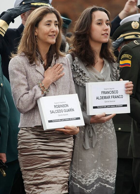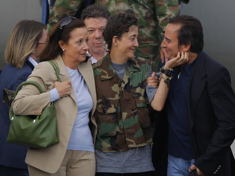 Este fue el único gesto de afecto que tuvo Ingrid Betancourt para su esposo el día en que finalmente fue liberada. | FOTO: ARCHIVO