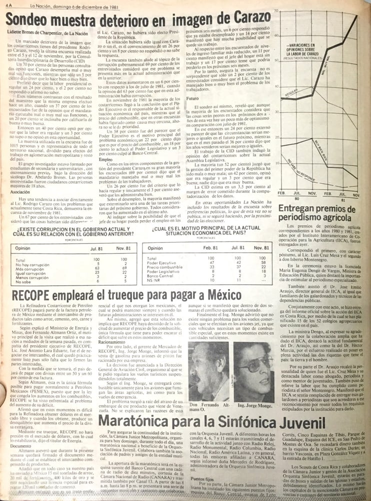 También hablan de cómo el dólar se disparó y la inflación se fue por las nubes. Los costarricenses que compraron La Nación para leer sobre el triunfo de Carazo pagaron ¢1. Cuatro años después, para informarse sobre la llegada de Luis Alberto Monge, debieron desembolsar ¢5.