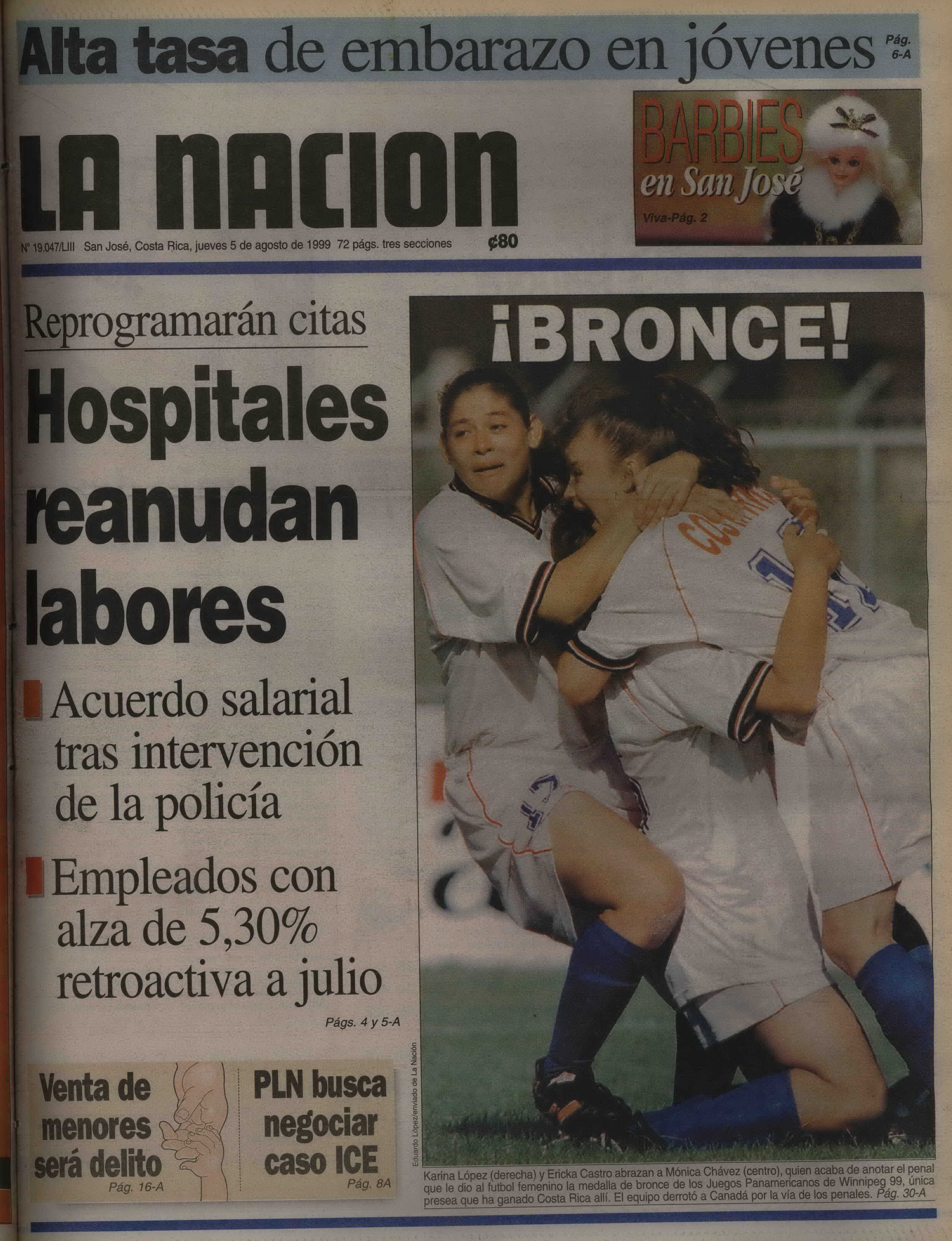El 5 de agosto de 1999, en la portada de La Nación se leía: “¡Bronce!”, con una foto en la que Karina López y Ericka Castro abrazaban a Mónica Chávez, quien marcó el penal con el que la Sele subió al podio.