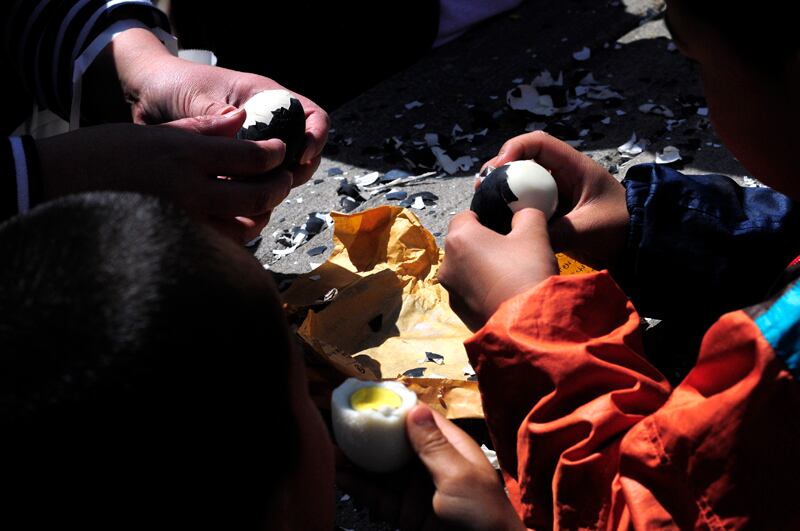 El lugar para comerse el “platillo” está repleto de mesas pero no tiene una sola banca. El suelo es una gran alfombra negra y crujiente, gracias al cúmulo de restos de cáscaras que van quedando como evidencia de los últimos clientes que han pelado allí sus huevos.