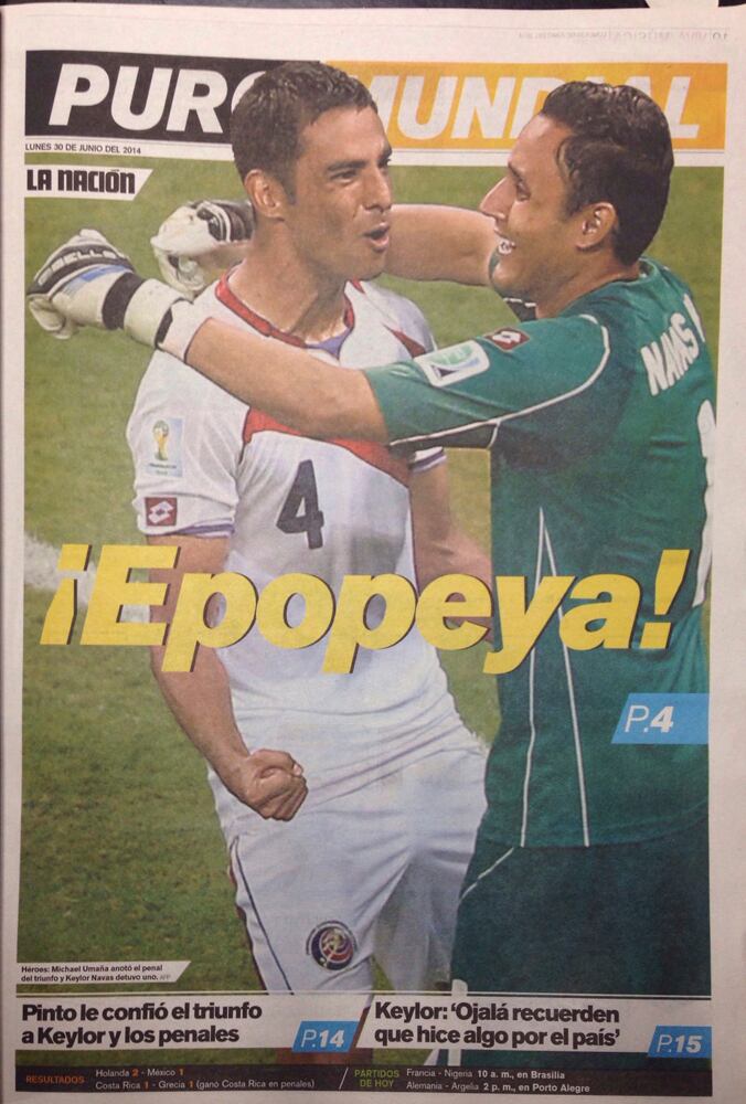 ‘Epopeya’, ‘Keylor en el Olimpo’, fueron los titulares de La Nación . El primero apareció en la portada del diario, el segundo en la imagen principal de la sección Puro Deporte.