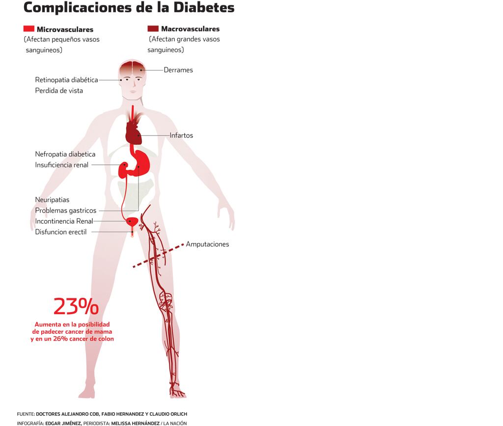 El mapa de estos padecimientos empieza con la retinopatía diabética, la nefropatía diabética y, por último, la neuropatía, explica Alejandro Cob, jefe de endocrinología del Hospital San Juan de Dios. Y es que la diabetes mal controlada puede llevar a la ceguera. La retinopatía diabética consiste en la oclusión de los vasos sanguíneos de la retina. “Esto genera la liberación de sustancias que producen la creación de nuevos vasos sanguíneos que tienden a sangrar, se contraen y desprenden la retina”, precisa el oftalmólogo Claudio Orlich.