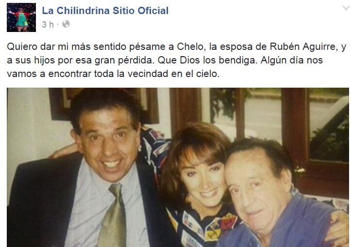 María Antonieta de las Nieves, más conocida como la Chilindrina, escribió en Facebook: "Quiero dar mi más sentido pésame a Chelo, la esposa de Rubén Aguirre, y a sus hijos por esa gran pérdida. Que Dios los bendiga. Algún día nos vamos a encontrar toda la Vecindad en el cielo".