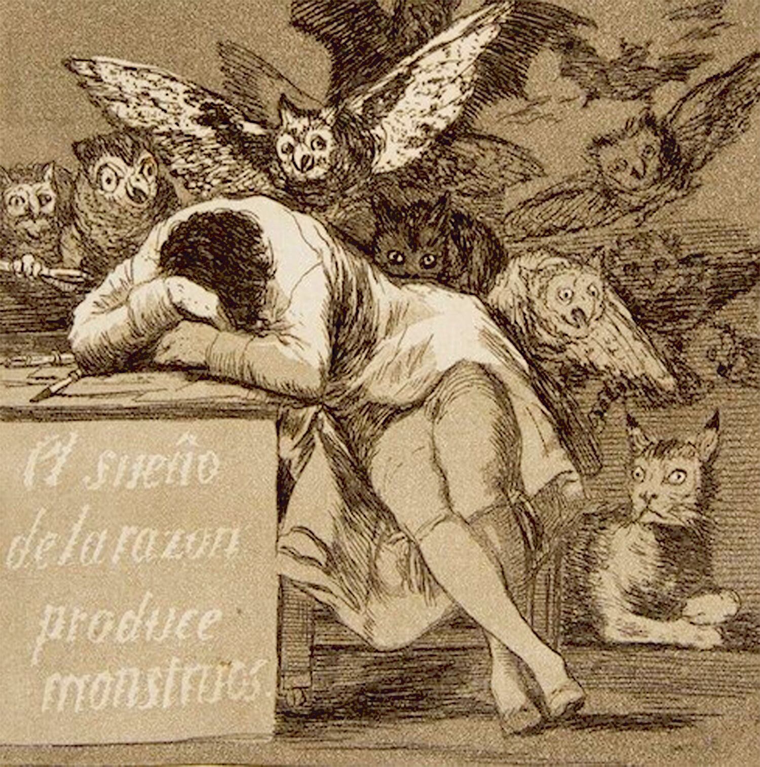 Uno de los grabados más famosos de Francisco de Goya lleva la leyenda “El sueño de la razón produce monstruos”. Muestra a un hombre que se quedó dormido sobre su escritorio, acosado por un revuelo de lechuzas y murciélagos, al que un gato observa perplejo desde el suelo.