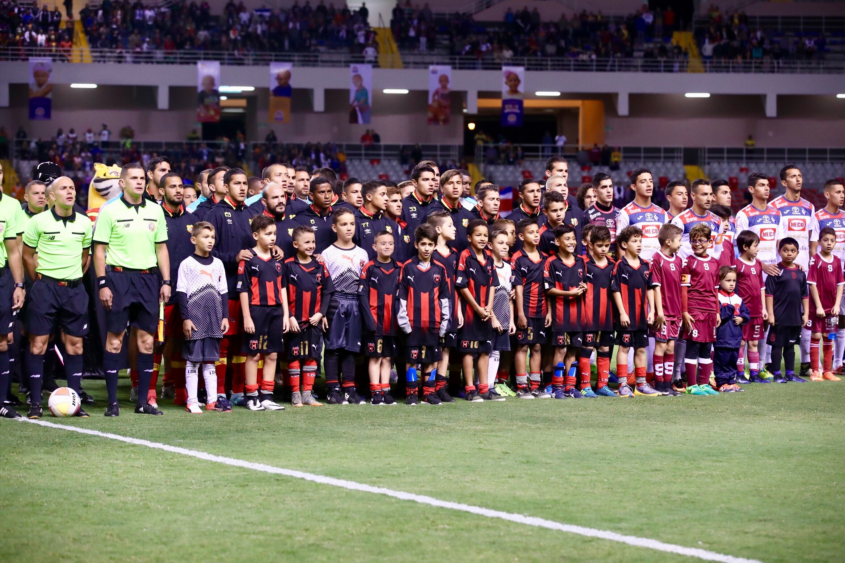 Alineación de Alajuelense: Adonis Pineda, Cristopher Meneses, Esteban Marín, Kenner Gutiérrez, José Andrés Salvatierra, Pablo Gabas, Luis Garrido, Allen Guevara, José Luis Cordero, Róger Rojas y Jonathan McDonald. DT: Nicolás Dos Santos.