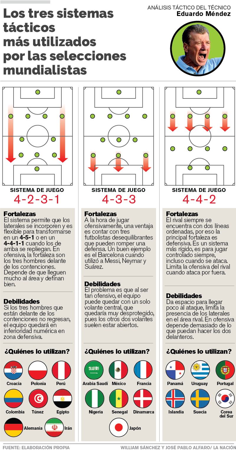 Croacia, Polonia, Perú, Colombia, Túñez, Egipto e Irán utilizan el que tiene únicamente un punta en ataque, mientras que Arabia Saudí, México, Francia, Nigeria, Senegal, Dinamarca y Japón se decantan por el de tres artilleros.