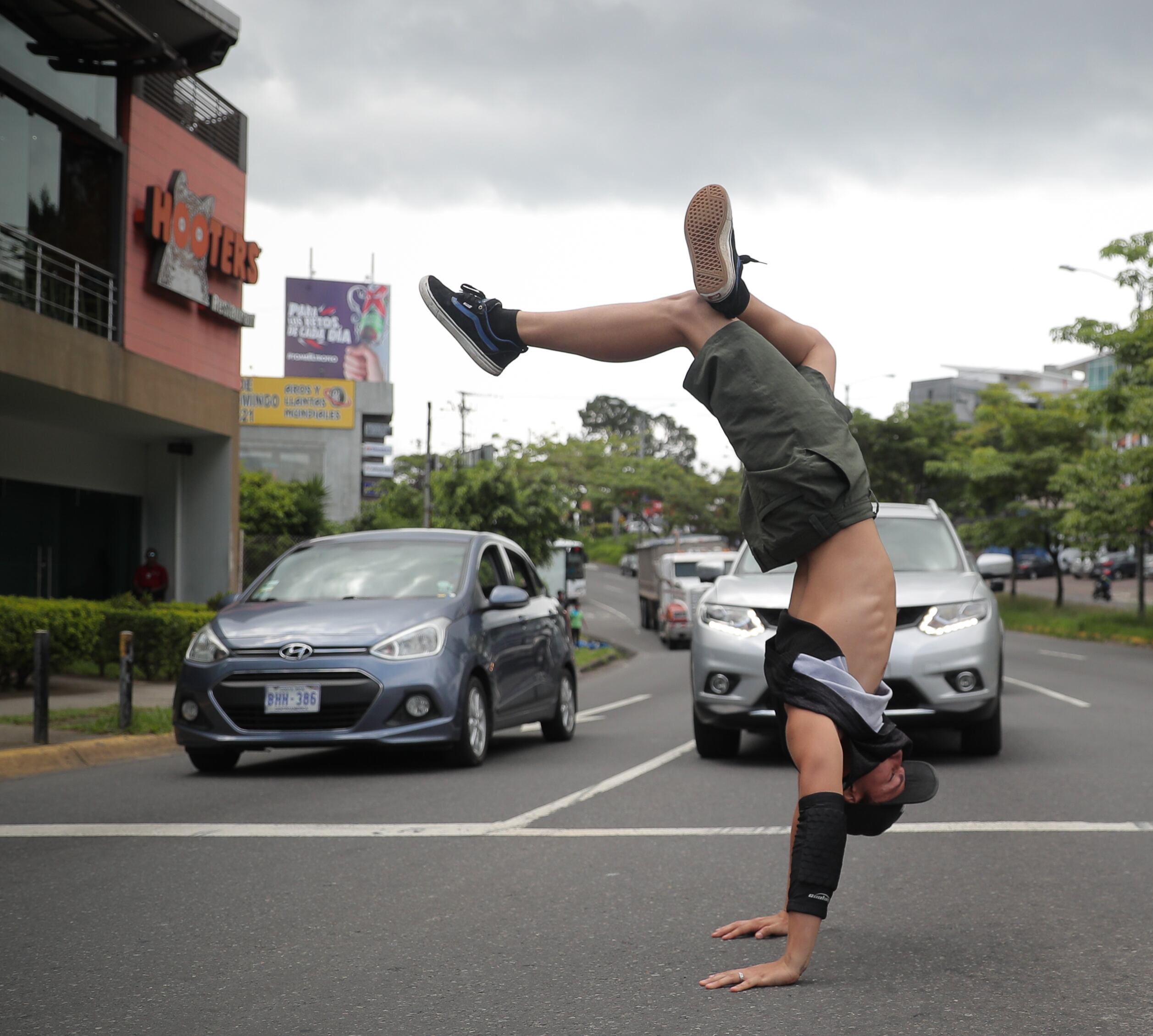 Bailando breakdance, con callos en las manos, moretes en las piernas y raspones en las rodillas estaba el alajueliteño Alcides Espinoza, de 19 años. Aprendió a bailar en la calle, su sueño es que alguien lo descubra y poder salir del país a bailar. Muchos como él apuntan a la internacionalización.