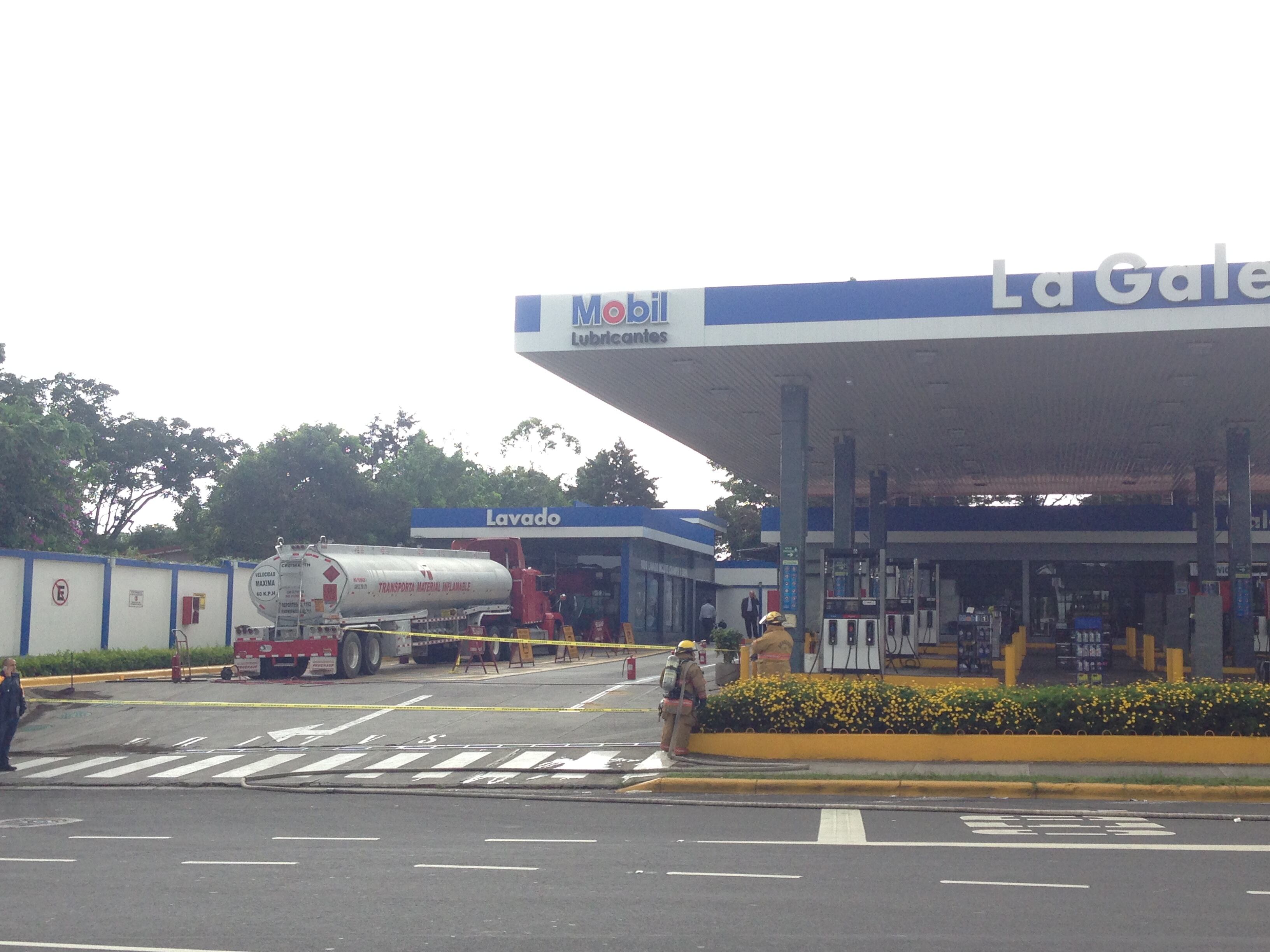 Tres unidades de Bomberos atienden desde las 2:31 p. m. el derrame de 2.271 litros de gasolina súper en la bomba La Galera en Curridabat.