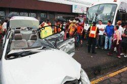 Un titubeo costó la vida ayer a dos turistas cuyo auto fue arrollado por un bus de Orosi al costado noreste de los tribunales de Cartago.