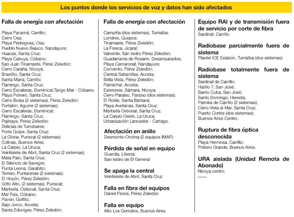Los puntos donde los servicios de voz y datos han sido afectados son: