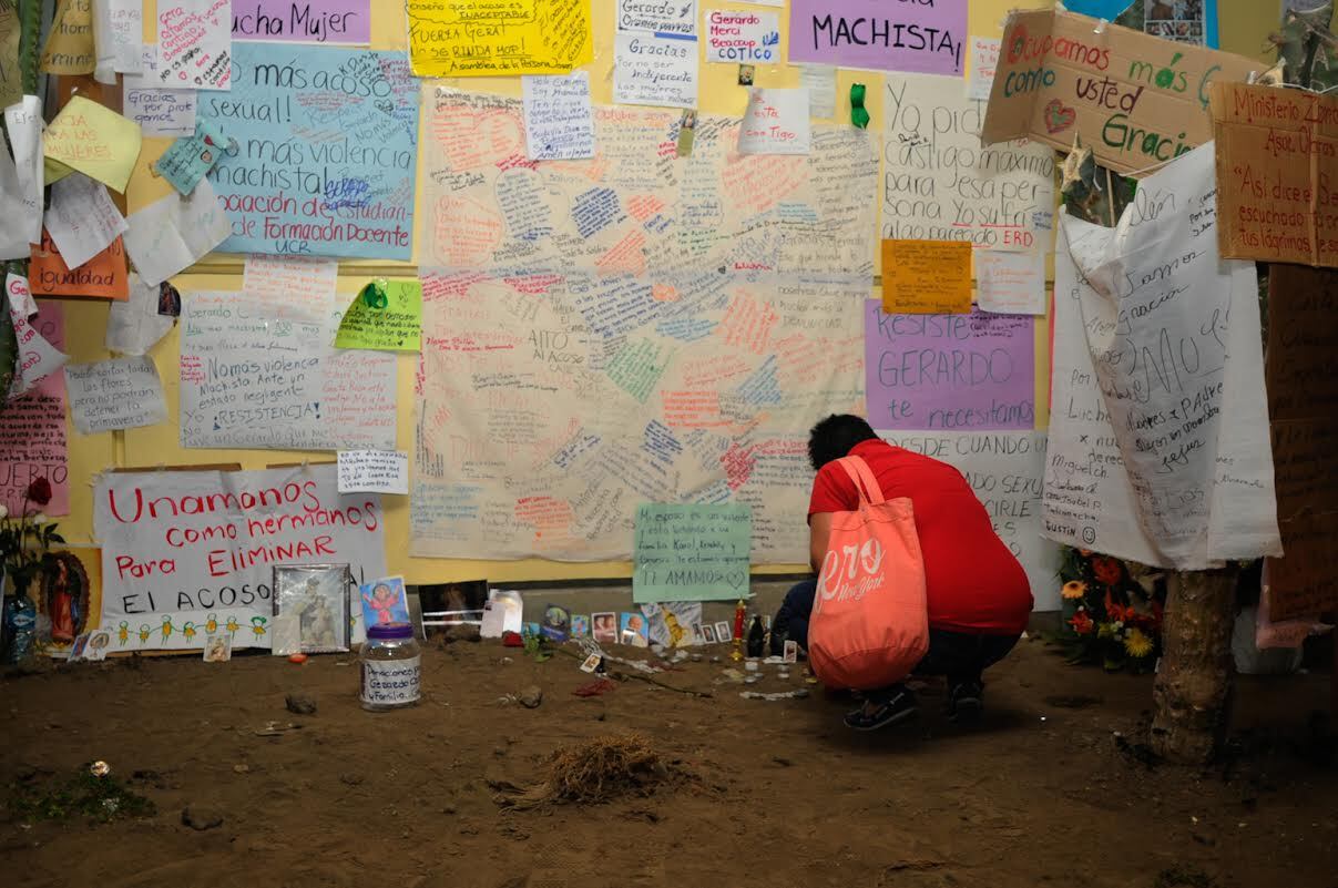 Una mujer enciende una vela en una especie de mural que está en las afueras del centro médico donde muchas personas han llevado estampas religiosas para rogar por la salud del joven. (Rafael Murillo)