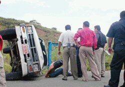 Con el golpe, el vehículo volcó y se le quebró el parabrisas.