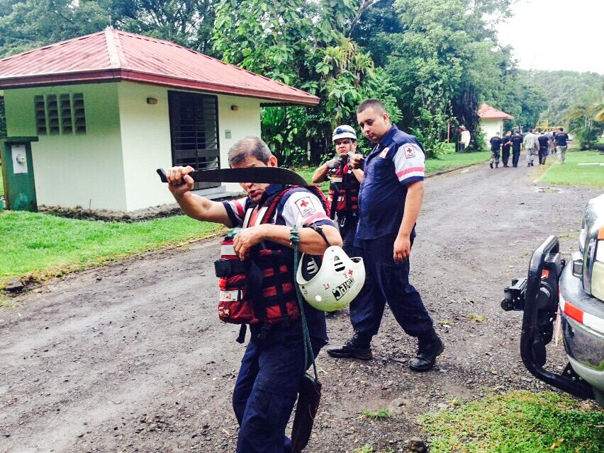 Socorristas de la Cruz Roja se preparan para continuar con la búsqueda de un agente del OIJ que desapareció en la Universidad Earth, Limón. (Reiner Montero)