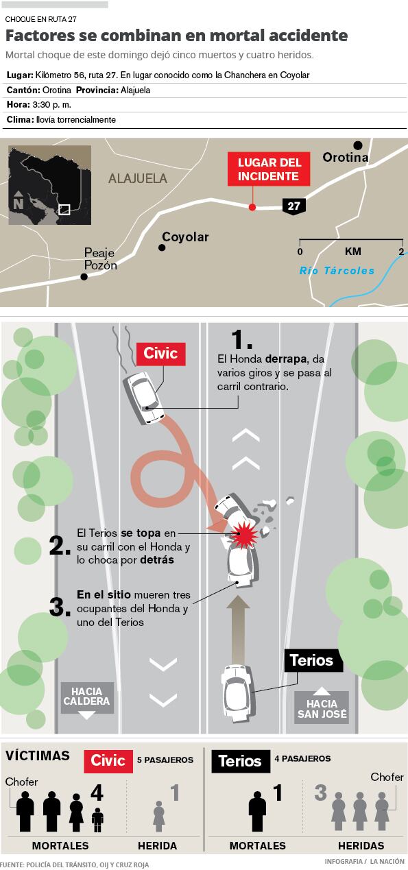 Freddy Jiménez Bermúdez, oficial de la Policía del Tránsito de la delegación de Orotina y quien estuvo presente en el sitio del percance, confirmó que el choque ocurrió cuando en el lugar llovía de forma torrencial.
