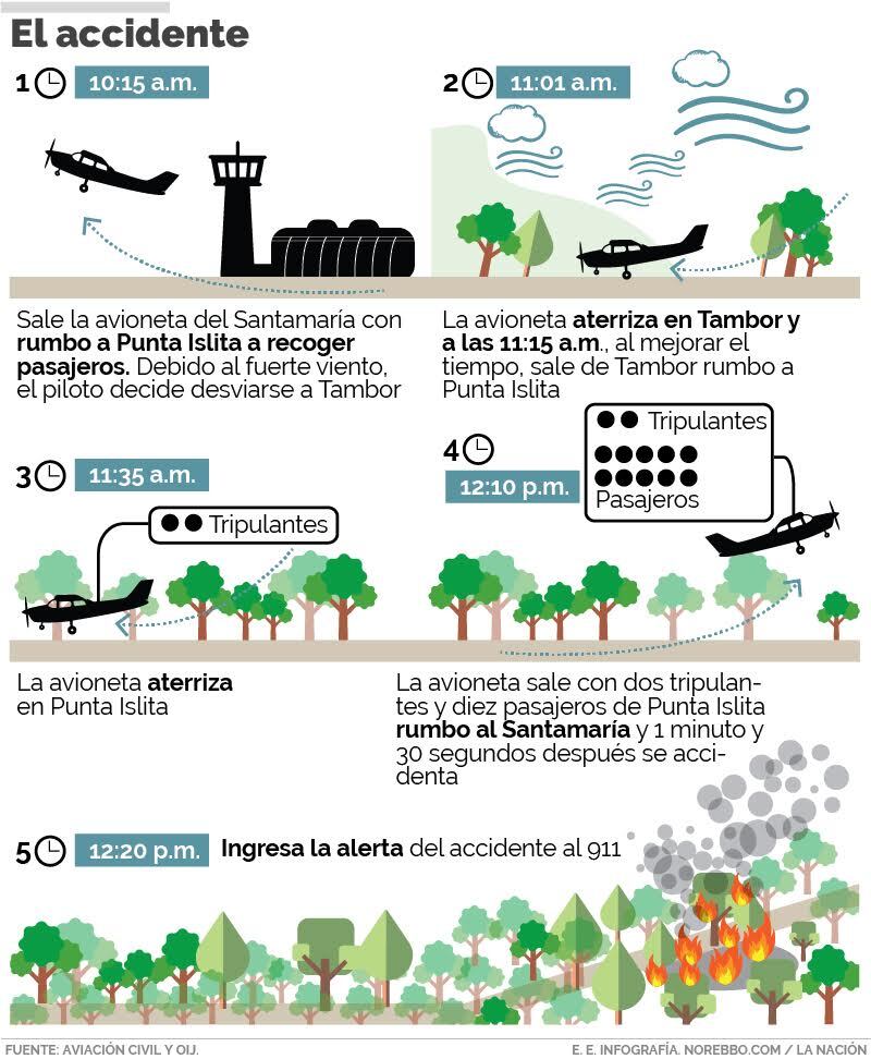 El accidente aéreo ocurrió este 31 de diciembre poco después de las 12:10 p. m. cuando el avión con 12 personas se precipitó en una ladera sembrada con árboles de teca en el cerro los Viales, en Corozalito, en el distrito de Bejuco, del cantón de Nandayure, Guanacaste.