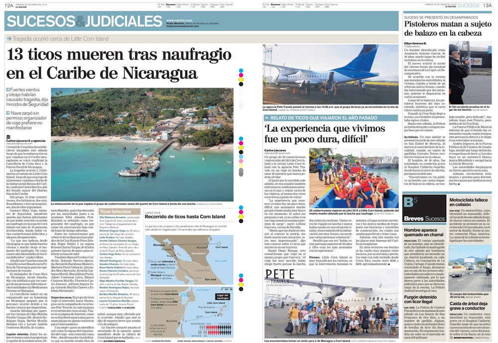 El sábado 23 de enero del 2016, las autoridades de Nicaragua confirmaron el naufragio de una embarcación en el mar Caribe. Murieron 13 turistas costarricenses, de un grupo de 25.