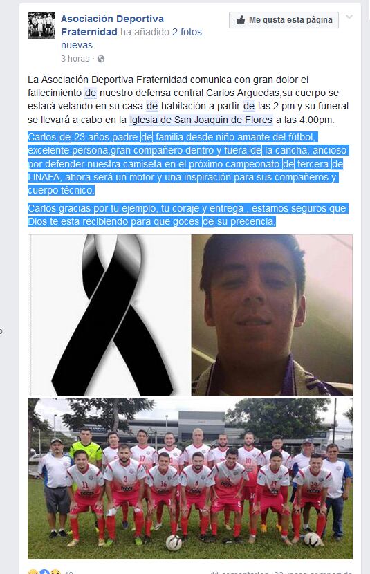 Al expresar su dolor escribieron: "Carlos, de 23 años, padre de familia, desde niño amante del fútbol, excelente persona, gran compañero dentro y fuera de la cancha..."