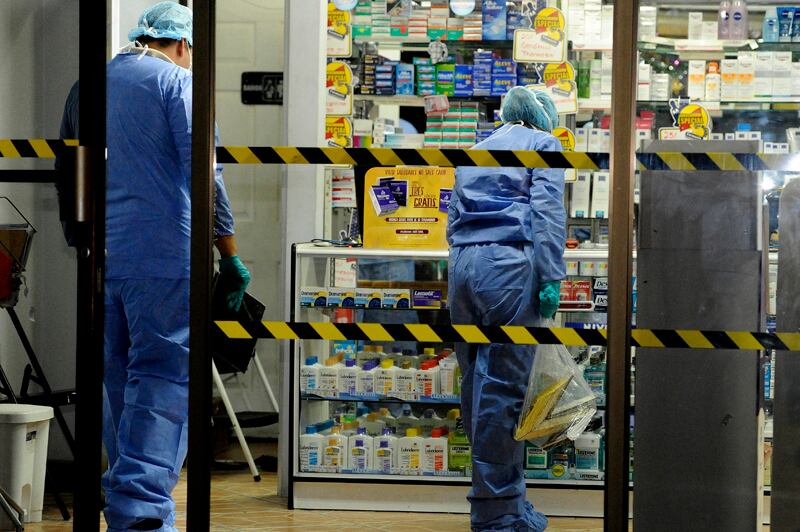 Un testigo, quien prefirió el anonimato y que estaba fuera del local, manifestó que los dos tipos que entraron portaban cascos y aprovecharon para asaltar un cliente de la farmacia.