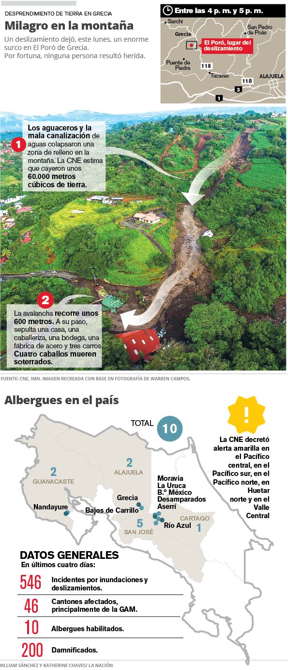 Otros de los aludes a los que les prestan atención son los ocurridos en la Picadera de Santa Ana y en Acosta y el que se dio el lunes en El Poró de Grecia. "Se desalojaron más de 130 personas en Santa Ana y ahí vamos trabajando para evitar una desgracia mayor", puntualizó Brenes.