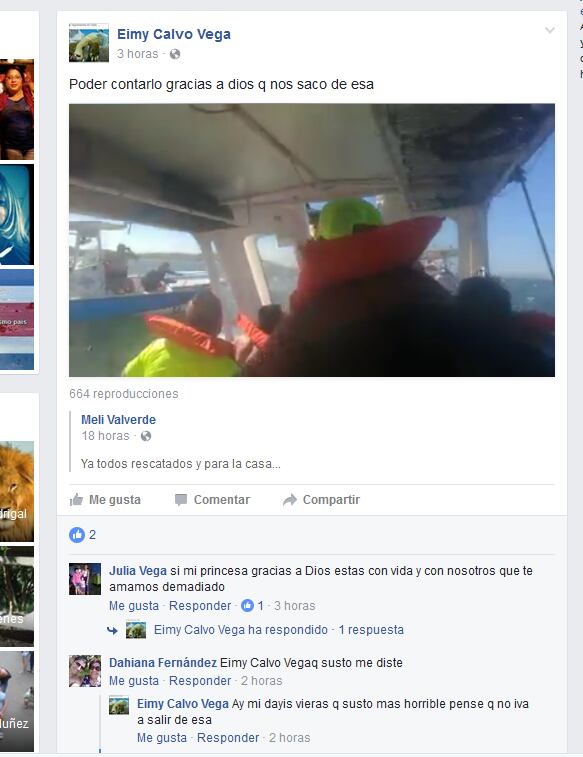 En su perfil de Facebook, Eimy Calvo, de 24 años, dice: "Gracias a Dios, que nos sacó de esa" y publica el video de los momentos trágicos que vivieron.