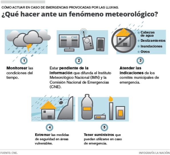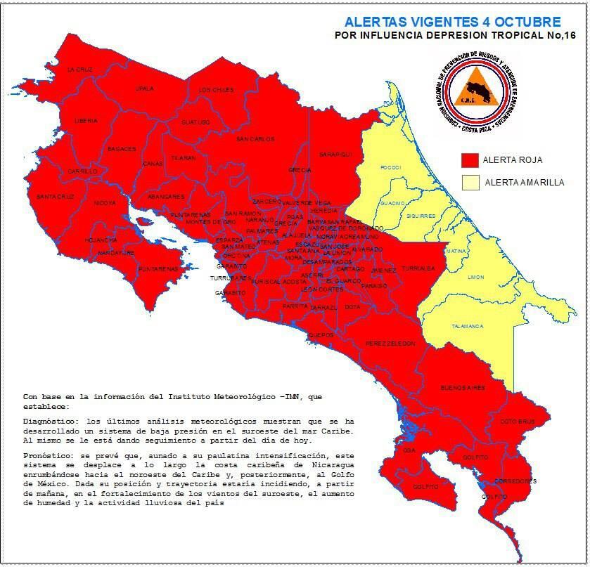 Las autoridades de la Comisión Nacional de Emergencias (CNE) declararon alerta roja para todo el litoral Pacífico, Valle Central y zona norte y alerta amarilla en el Caribe debido a la influencia de la depresión tropical número 16.