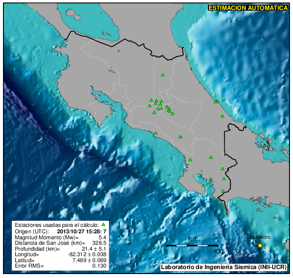 Un temblor de 5,4 grados (M W) se sintió a las 9:30 a. m., 123 kilómetros al sureste de Corredores, según el reporte del Laboratorio de Ingeniería Sísmica de la Universidad de Costa Rica.