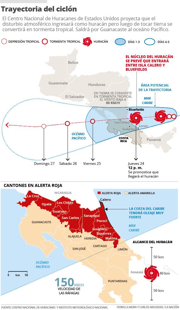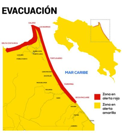"Estamos en alerta roja en el Caribe norte y las costas, desde Boca Pacuare hasta Delta Costa Rica. Debemos aprovechar hoy (martes) porque ya no poderemos evacuar mañana (miércoles). Las personas en zonas de riesgo serán trasladadas a zonas de seguridad, necesitamos preservar la vida de las familias costarricenses", explicó Solís.
