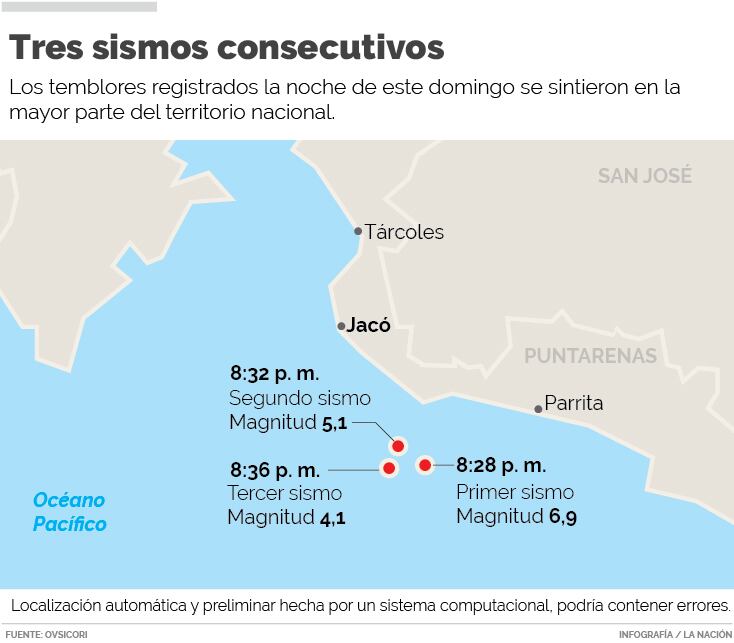 El movimiento principal del domingo a las 8:28 p. m., de 6,9 grados, acumula casi 100 réplicas según la Red Sismológica Nacional (RSN), que situó el epicentro en aguas del Pacífico central, específicamente frente a Jacó, en Garabito, Puntarenas.