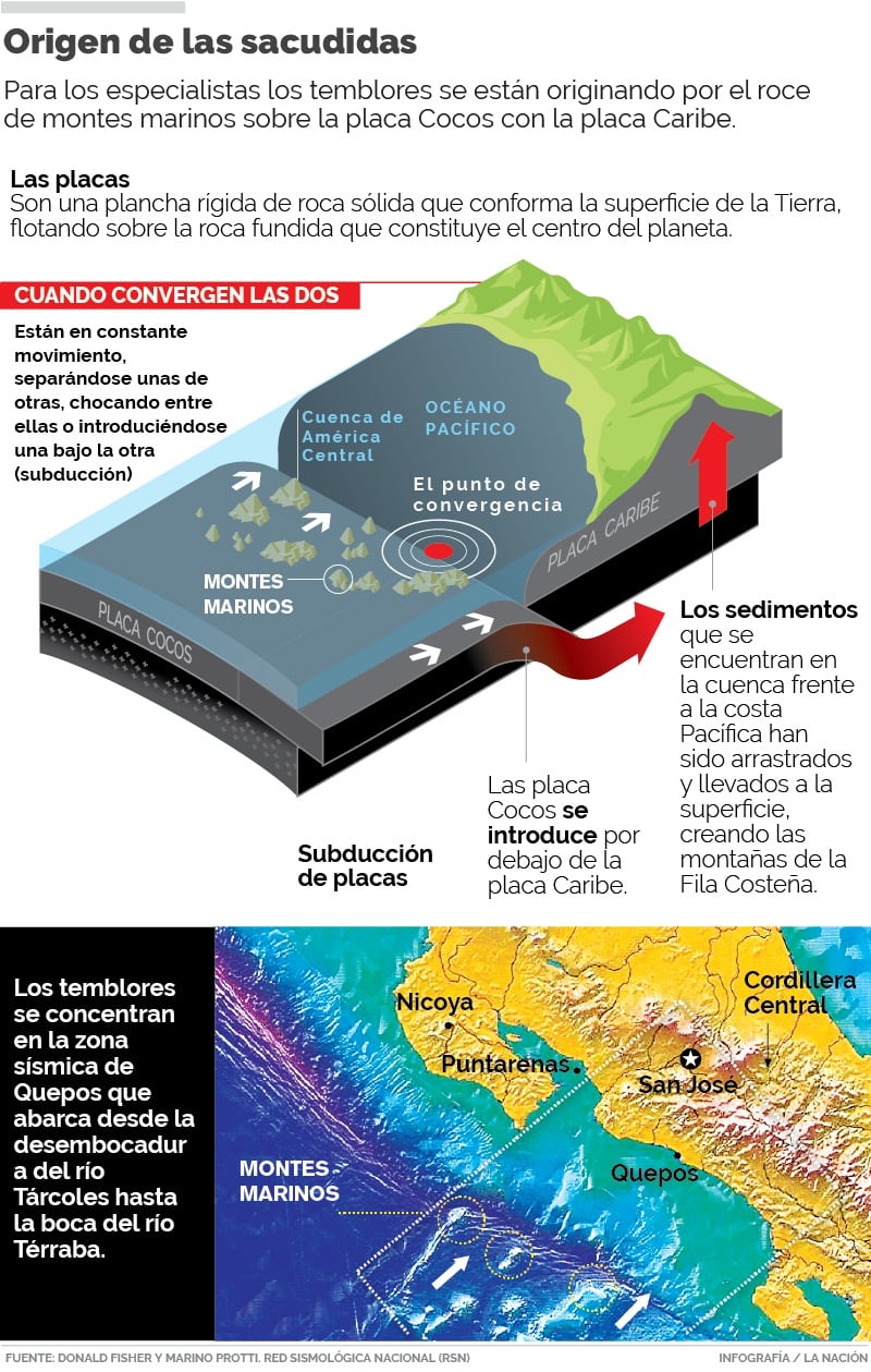 "El comportamiento de estas placas continuará igual. En la parte central del país hay una serie de montes submarinos que, cuando se subduce Coco por debajo de Caribe, esas asperezas bloquean estos grandes bloques tectónicos en esas zonas de montes hasta que el movimiento de las placas las libera con fuerza y tenemos sismos", confirmó Mauricio Mora, sismólogo de la RSN.
