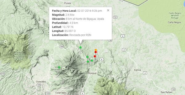 El epicentro de los temblores se ubicó seis kilómetros al norte de Bijagua, distrito que se encuentra en las faldas del volcán Miravalles.