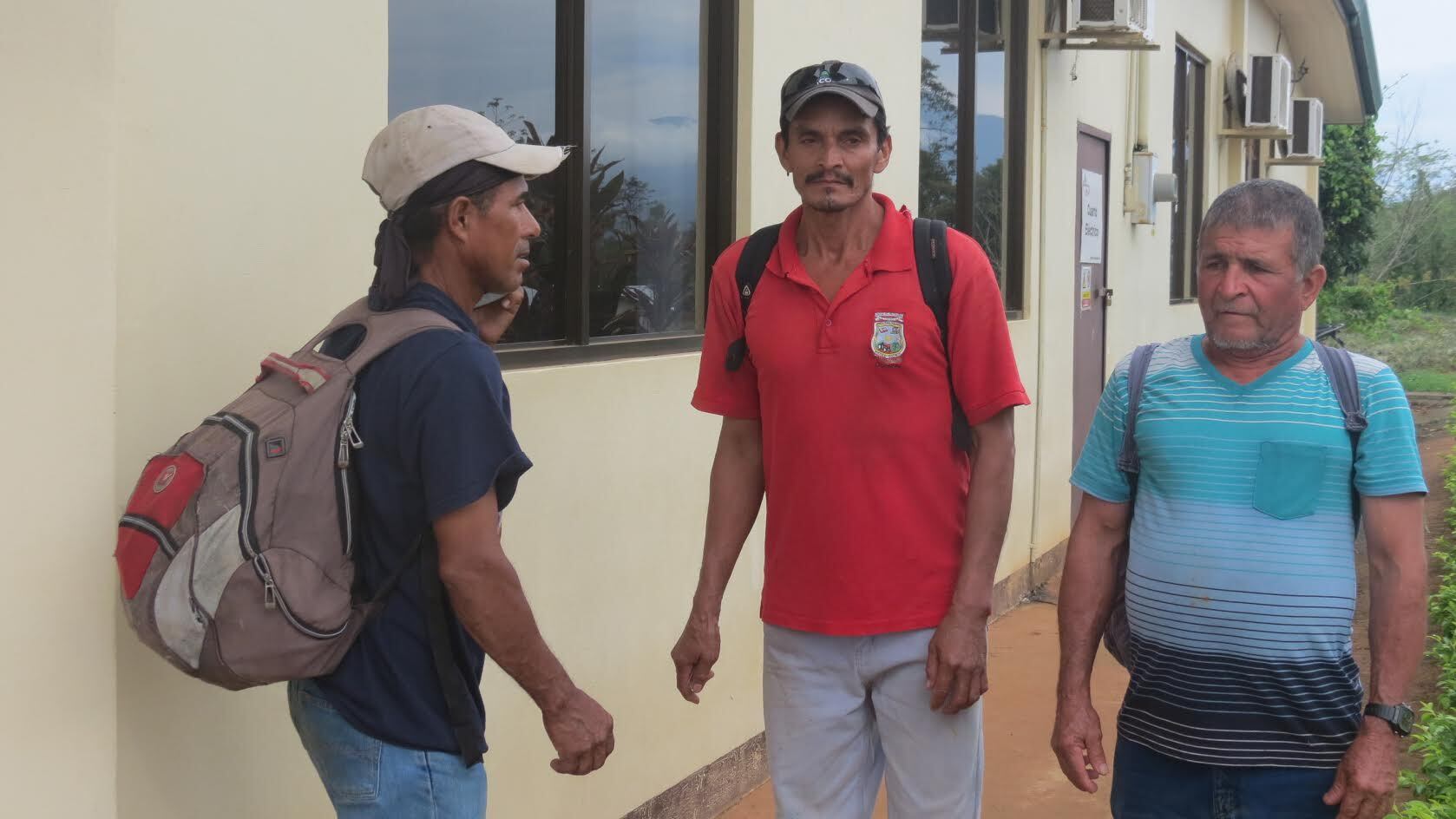 Los trabajadores, de izq. a der., Inocente Gaitán, José González y Ólger Mésen después de recibir atención médica llegaron a la finca Agromonte a recoger sus pertenecias. Ahí relataron lo sucedido. (Carlos Hernández)