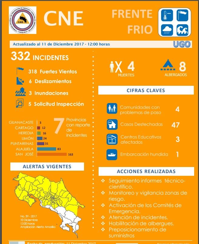 Según el último reporte de la CNE, con un cierre de datos al mediodía de este lunes, los habitantes de San José y Alajuela han sido los más afectados con el frente frío que golpea el país desde el sábado, según el último informe de la Comisión Nacional de Emergencias (CNE).